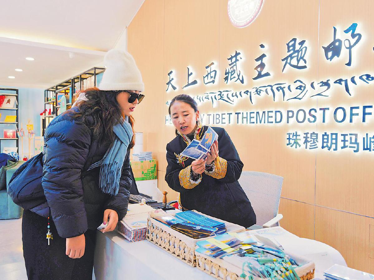 “想與珠峰相見,需要一些天時地利的運氣。所以,不論是幸福的還是帶著遺憾的游客,常常選擇在這里寄一枚明信片,讓大美珠峰成為永久的留念。”措姆告訴記者,珠峰郵局每天的營業時間是9∶30—19∶30。但由于想寄信留念的游客太多了,自己通常會延長營業時間,盡力服務好每一位遠道而來的客人。暑期旺季,措姆一天最多能收寄2000多件信件,經常忙到深夜12點才回宿舍休息。“措姆做事踏實認真,她堅守在郵局,為珠峰旅游發展作出了很大貢獻。”在定日縣文旅局副局長高陽平看來,措姆就像盛開在高原的格桑花,歷經風雪卻屹立不倒。