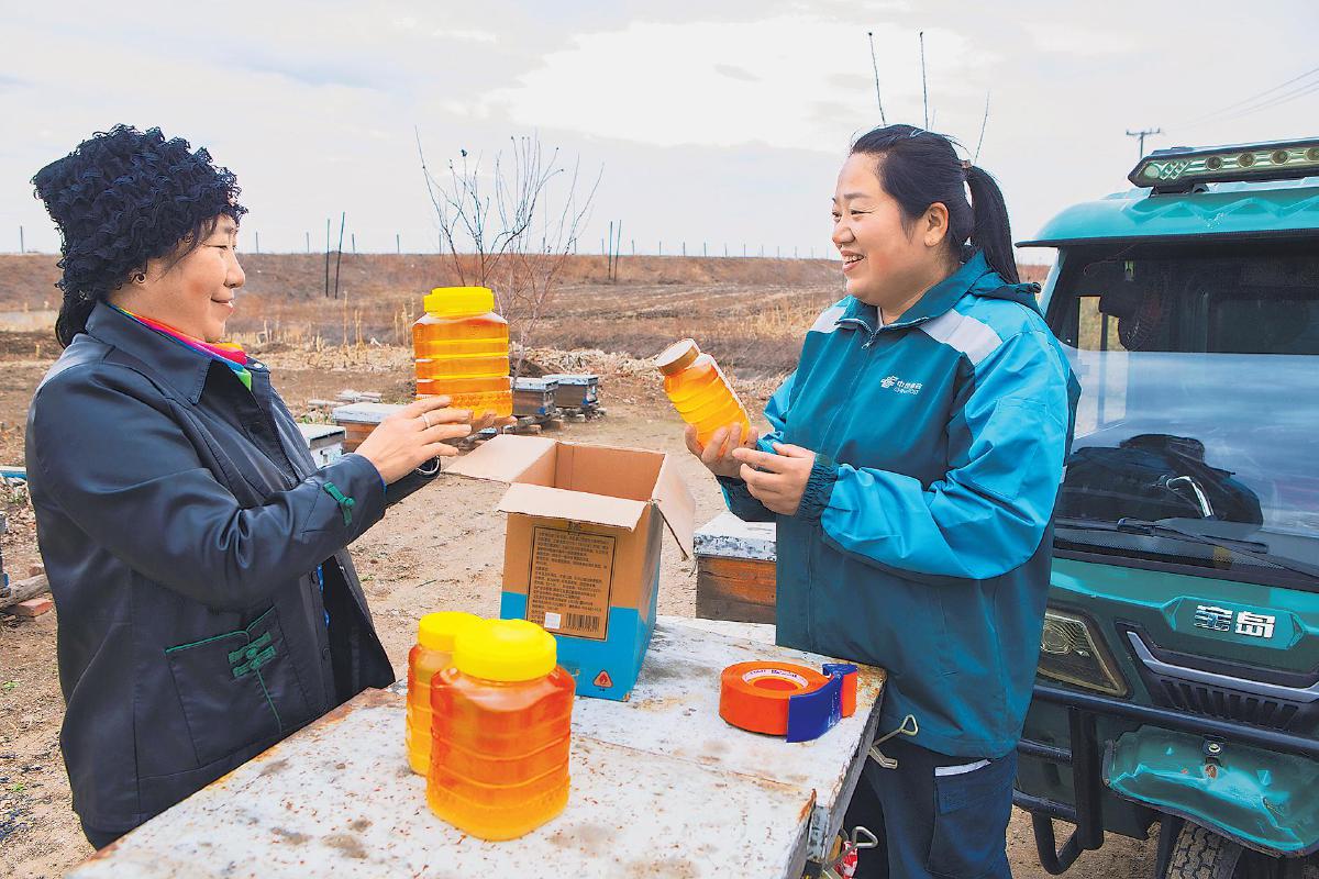 王微摸清了常勝鄉蜂農的分布情況后,積極利用投遞機會與蜂農分享微商銷售方法,幫助他們建立線上銷售渠道。她用淳樸的語言向買家推薦當地的優質蜂蜜,贏得了一大批回頭客。打開網絡銷售渠道后,王微主動到蜂農家收取蜂蜜郵件,還為他們提供打包、封裝、貼單的“一條龍”服務。目前,王微已累計寄遞蜂蜜郵件達4700余件。