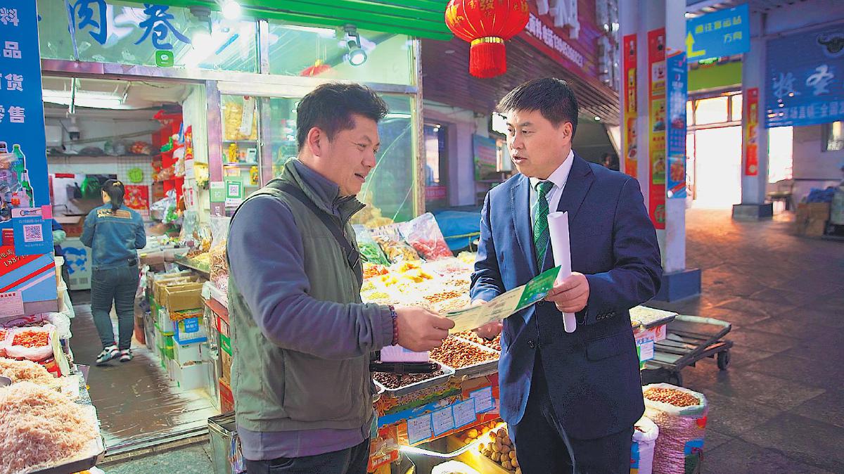 周慶水向網(wǎng)點周邊商戶宣傳業(yè)務(wù)。