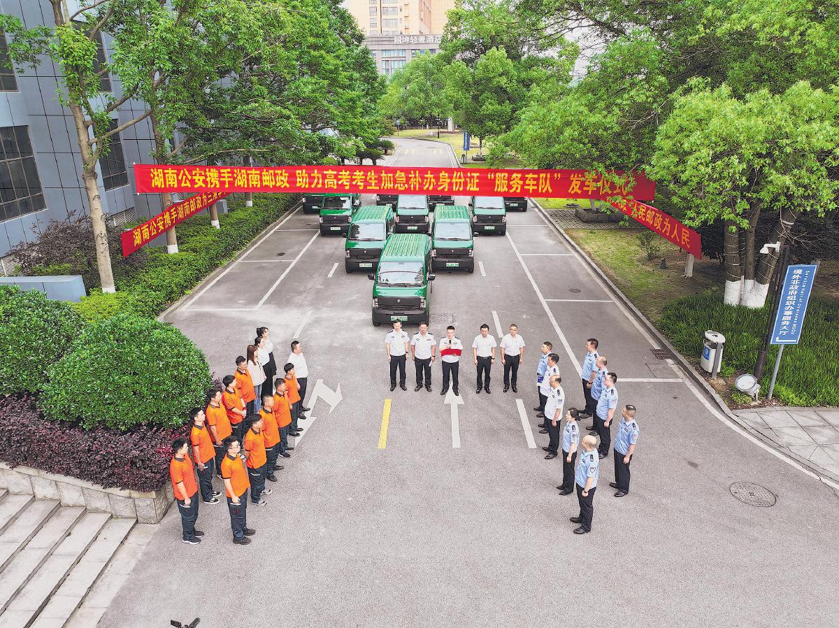 6月5日上午,湖南省公安廳、湖南省郵政分公司在省公民信息管理局?jǐn)y手舉行高考考生身份證加急補(bǔ)辦“服務(wù)車隊(duì)”發(fā)車儀式。這是湖南警郵連續(xù)第七年為中高考考生開(kāi)通身份證補(bǔ)辦加急“綠色通道”。