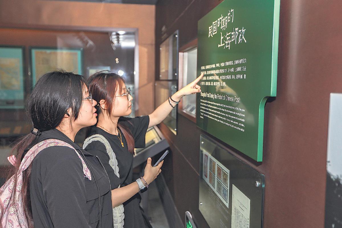 上海工商職業技術學院學生認真參觀上海郵政博物館展覽。