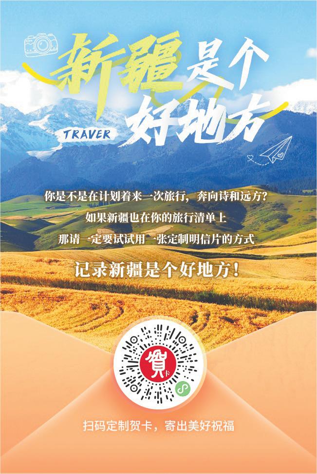 當指尖輕點,祝福帶著天山的清風、大漠的遼闊、湖泊的清澈飛向遠方時,一份對新疆的向往也隨之悄然生根。這枚方寸之間的賀卡,承載著郵政服務民生的溫度,更鏈接著新疆文旅產業無限可能的璀璨未來——每一次分享,都是新疆走向世界的腳步;每一次心動,都是文旅繁榮的嶄新起點。