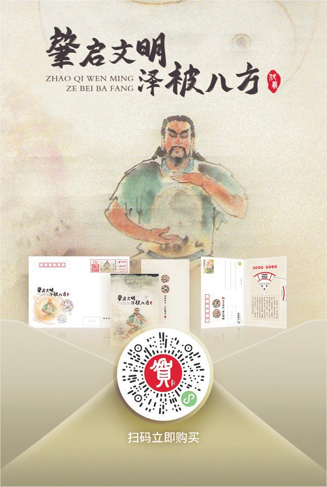 其中,《肇啟文明 澤被八方》明信片的設計十分新穎,畫面以水墨為底,暈染出伏羲的神韻,仿佛能看到遠古智者的沉思;一幅可轉動的八卦圖嵌入其中,輕輕撥動,“乾、坤、震、巽……”這些蘊含宇宙相生規律的符號緩緩流轉,如同將“萬事順意、生生不息”的祈愿,通過指尖的觸碰傳遞到心底;配套的定制信封,印刻“羲皇賜?!ぐ素猿屑弊謽樱嘶市蜗笈c傳統八卦、祥瑞圖案相互交融。