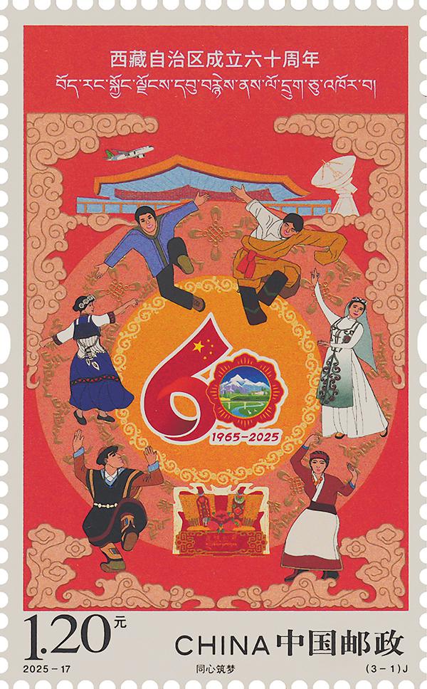 第一枚“同心筑夢”,畫面以西藏自治區成立60周年慶祝活動徽標為主體,四周環繞身著盛裝歡慶的各族人民,背景展現了拉薩機場、C919飛機、日喀則40米射電望遠鏡等元素,表現了西藏自治區成立60年來,各族人民在黨的領導下攜手共進、同心同行、民族團結進步的和諧畫面。