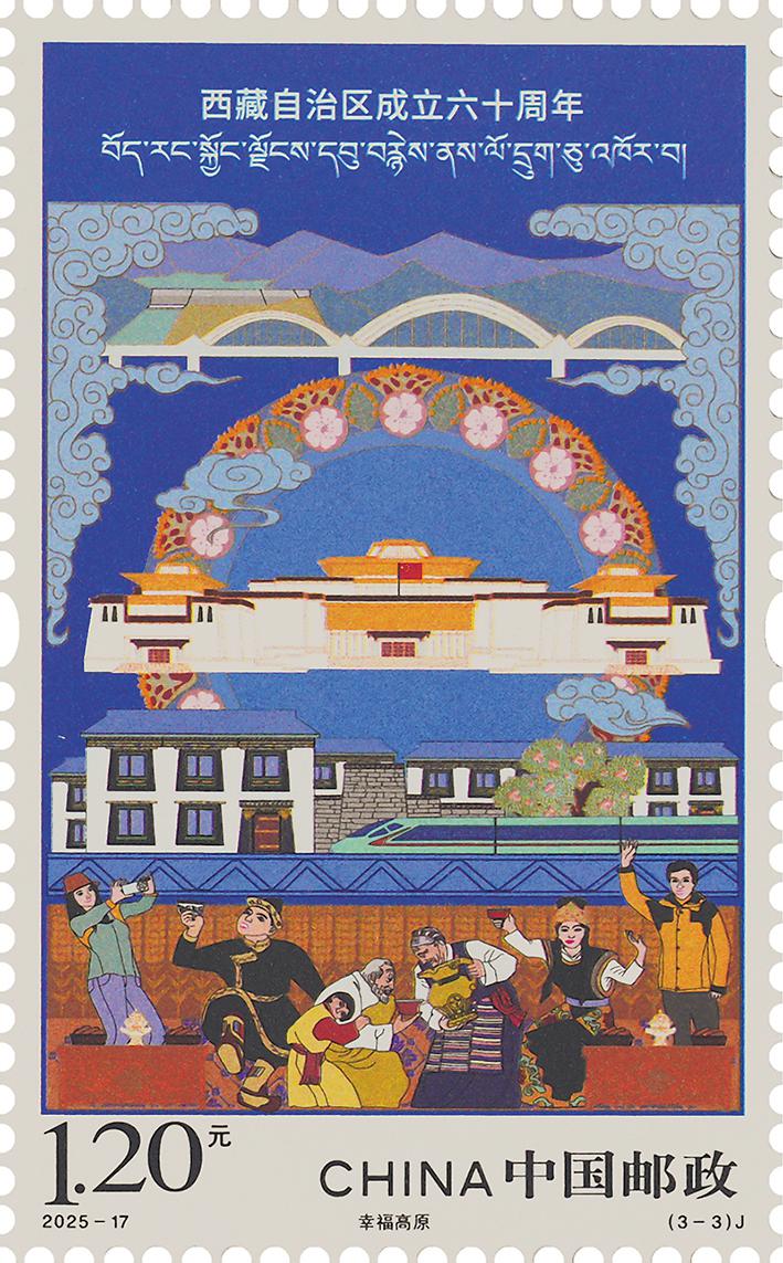 《西藏自治區成立六十周年》紀念郵票今日發行。該郵票1套3枚,郵票圖案名稱為:同心筑夢、美麗雪域、幸福高原。