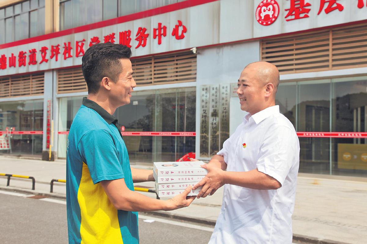 重慶市郵政分公司通過網點重點展示和視頻聯播宣傳,確保重大主題圖書發行工作高效推進。圖為江津郵政投遞員為鼎山街道艾坪社區及時配送《習近平談治國理政》第五卷?!跬醮禾m 崔卡 攝影報道