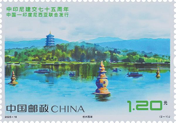 中國郵政定于8月30日發行《中印尼建交七十五周年》(與印度尼西亞聯合發行)紀念郵票一套兩枚,郵票圖案名稱為:杭州西湖、布拉坦湖。