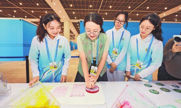 天津郵政充分發揮自身文化屬性,聚焦“傳統文化、大國外交、魅力天津”三大主題,結合天津城市特色,推出45款彰顯天津文化和郵政文化的郵品。同時,天津郵政設置郵品互動體驗區,展出中國首套郵票——大龍郵票。媒體記者和工作人員在欣賞郵票珍品的同時,還能體驗大龍郵票拓印制作過程(見圖),更加深刻感受到中國郵政的歷史厚重感以及天津的文化底蘊。