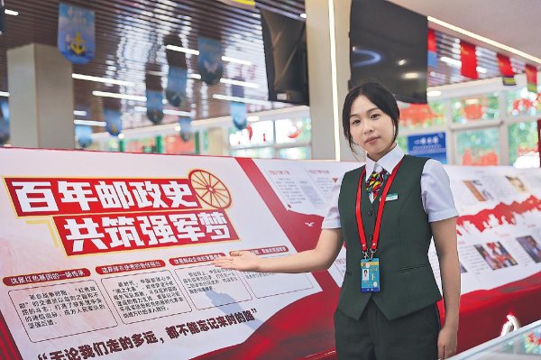 在“百年郵政史 共筑強軍夢”文化墻前,郵政工作人員為大家介紹用一枚枚郵票串聯起來的崢嶸歲月。