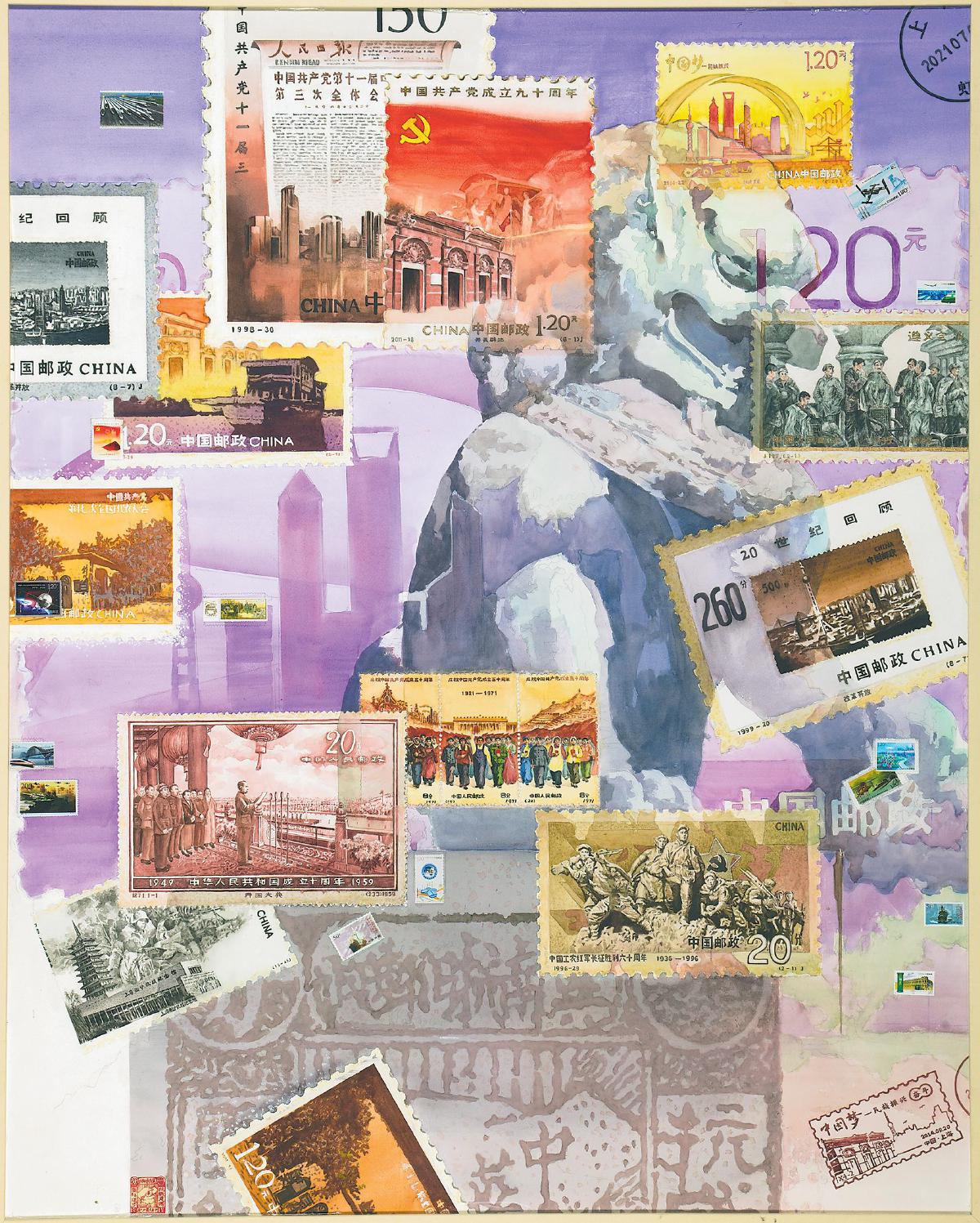 為了更好地完成畫作,田燕萍還請教了她的繪畫老師——浙江省美術家協會會員、水彩畫界策展人馬百齊?!胺酱鐚Ξ嬀?,頗有歷史和藝術的價值。”馬百齊肯定了田燕萍的創作思路,并在郵票選取、表現手法、繪畫技巧上對其進行了專業的指導。