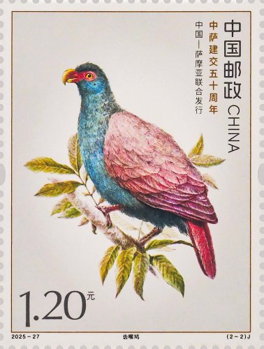 本套郵票以兩國的特色鳥類為核心設計元素,融西方鋼筆線條與東方淡彩的表現技法,筆觸細膩傳神,形象生動逼真,兩只禽鳥顧盼相應、神氣貫連,洋溢著蓬勃的生命力。本套郵票既展現兩國獨特的自然生態之美,更傳遞出兩國友誼的深厚底蘊與美好未來。第一枚郵票表現了白馬雞。作為四川丹巴莫斯卡鳥類重要棲息地的主要保護物種,白馬雞也成為丹巴自然生態的鮮活代表,當地獨特的高原氣候、適宜的生態環境為其提供了理想生存空間。第二枚郵票表現了齒嘴鳩。作為薩摩亞的本土特有鳥類,齒嘴鳩不僅是當地生態系統的重要成員,更被視為薩摩亞自然與文化遺產的象征,承載著薩摩亞人民對家鄉土地的熱愛與珍視。