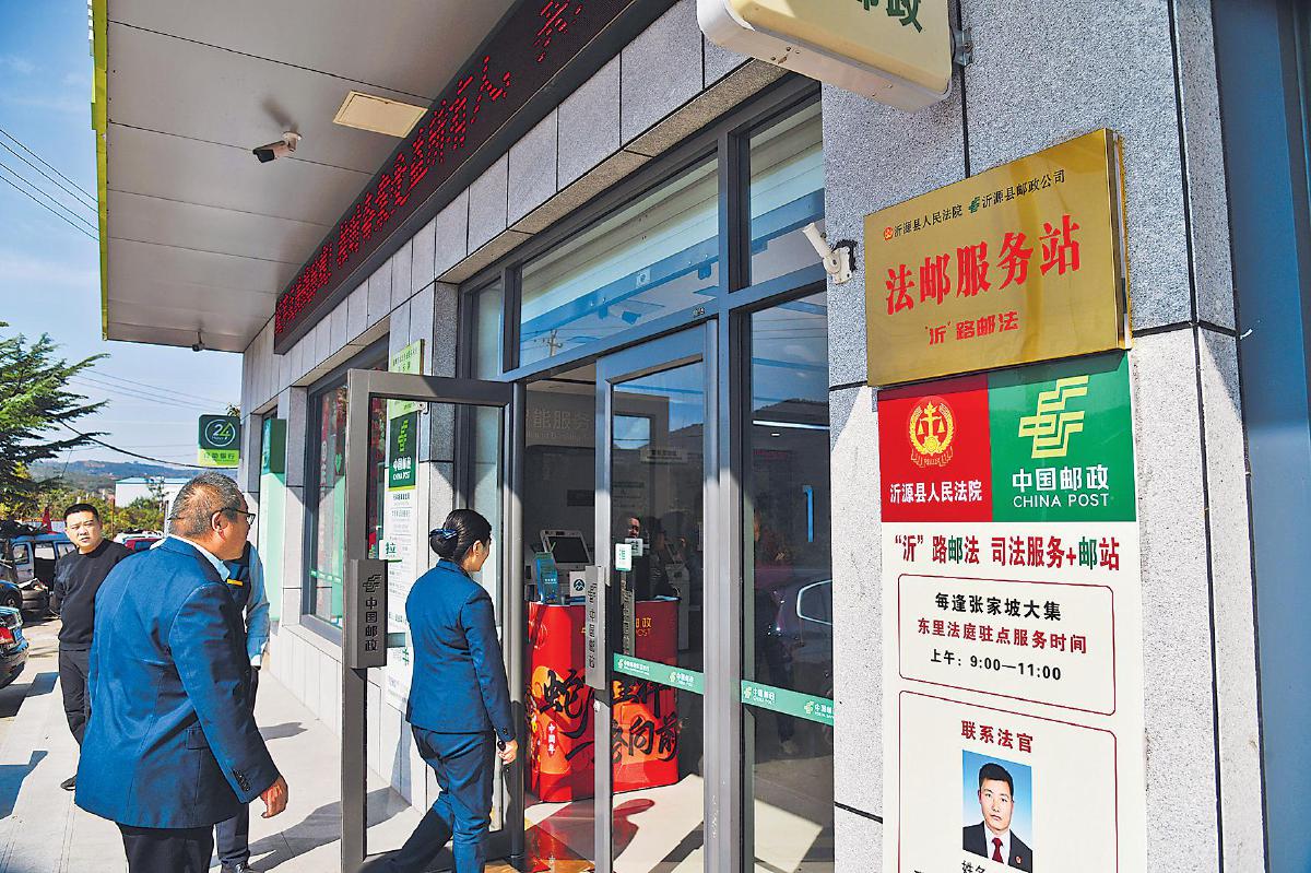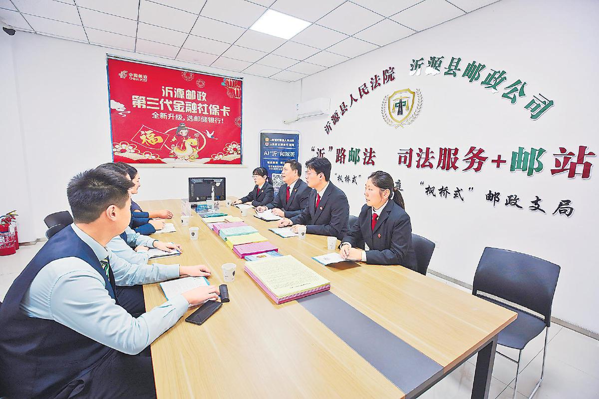 張家坡,山東省淄博市沂源縣東南30公里處的小鎮(zhèn)。鎮(zhèn)上的張家坡郵政支局里,藏著一項不尋常的服務——法郵服務站的司法服務。這是山東省高級人民法院與山東省郵政分公司攜手打造的“楓橋式”基層治理新樣板,也是司法服務“貼地而行”的生動實踐。群眾在“家門口”的郵局就能進行立案、咨詢、調(diào)解,甚至參與庭審;法律不再遙不可及,而是“一路有法、‘沂’路‘郵法’”。