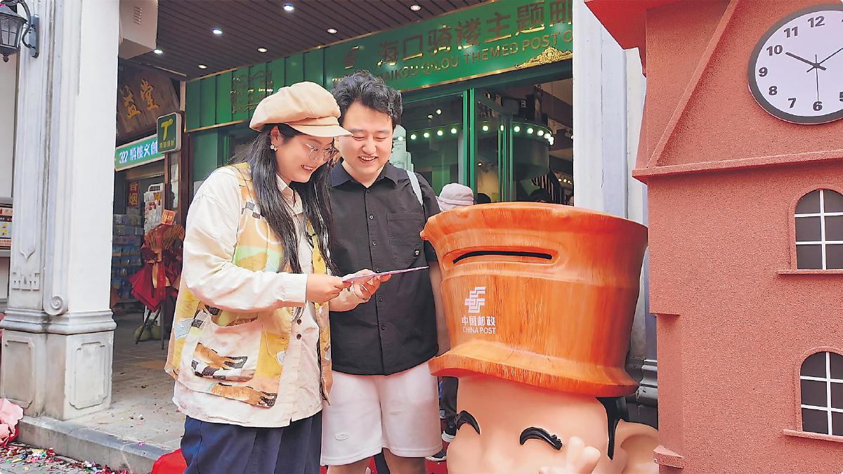 海口騎樓老街是首批“中國歷史文化名街”。騎樓主題郵局位于老街中心位置,郵局一樓設(shè)有打卡蓋戳區(qū)、文創(chuàng)產(chǎn)品區(qū)、集郵品區(qū)、政務(wù)圖書區(qū)、海南特產(chǎn)區(qū)和郵福咖啡吧,展架上擺滿了騎樓燈籠冰箱貼和騎樓主題郵局紀(jì)念封、主題郵冊等集郵文創(chuàng)產(chǎn)品;二樓陳列著郵政老照片、珍貴郵票,復(fù)原的老郵政辦公區(qū)成為熱門打卡點位。圖為一對來自甘肅的新婚夫婦在騎樓主題郵局郵寄紀(jì)念封,留下一份蜜月度假的美好記憶。