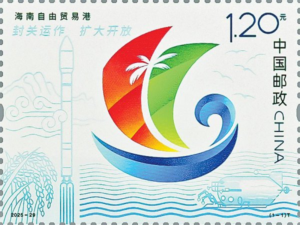 12月18日,海南自由貿(mào)易港將正式啟動(dòng)全島封關(guān)運(yùn)作。這一重大舉措,標(biāo)志著中國(guó)對(duì)外開(kāi)放進(jìn)入全新階段,對(duì)于加快吸引全球優(yōu)質(zhì)要素集聚、促進(jìn)海南自貿(mào)港高質(zhì)量發(fā)展具有重要意義。郵票畫面以海南自由貿(mào)易港形象標(biāo)識(shí)為主體,左上角表現(xiàn)了“封關(guān)運(yùn)作 擴(kuò)大開(kāi)放”宣傳語(yǔ);畫面背景繪有五指山、稻穗、火箭、深海勇士號(hào)載人潛水器、數(shù)據(jù)傳輸(無(wú)色熒光)等元素,展現(xiàn)出“五向圖強(qiáng)”高質(zhì)量發(fā)展新圖景,寓意海南自貿(mào)港向著加快建設(shè)具有世界影響力的中國(guó)特色自由貿(mào)易港目標(biāo)奮勇前進(jìn)。