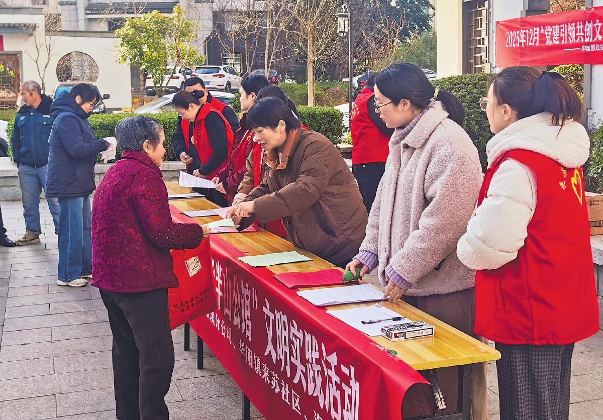 12月15日,安徽省績溪縣半山公館小區廣場人頭攢動,來蘇社區黨委和績溪縣郵政分公司黨支部在此聯合開展主題黨日活動。