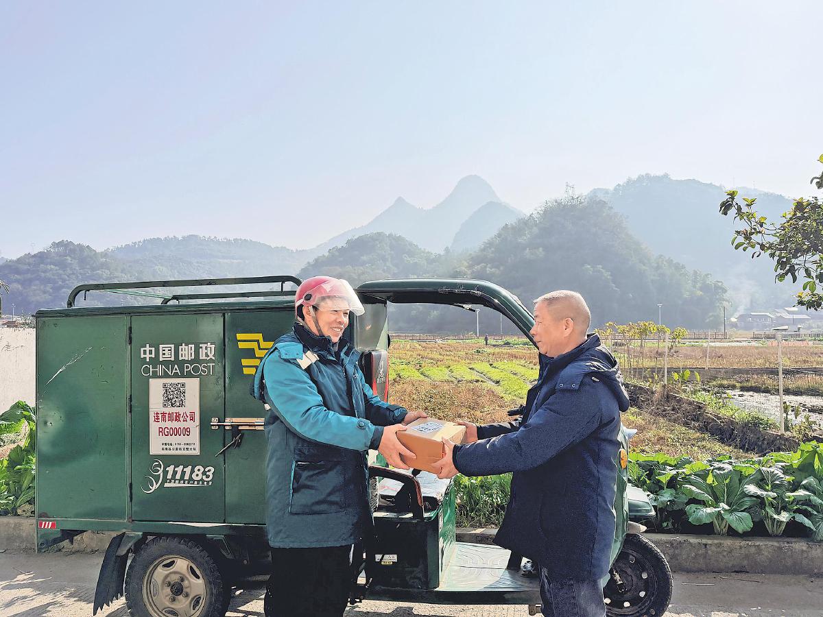 投遞員唐志輝將郵件交到村民手中。 □鐘桔瀅 攝