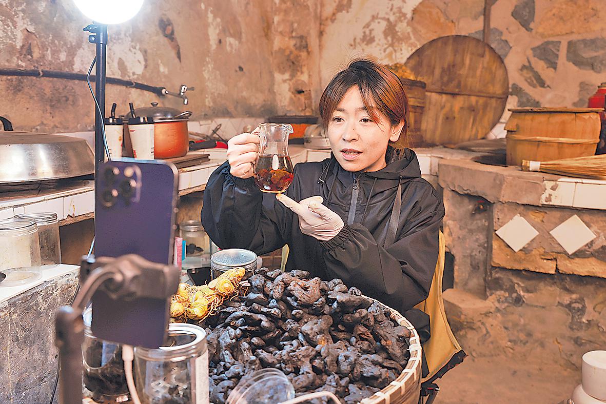 主播“@鄉村夏天”在直播推銷當地特產九制黃精。□吳俊杰 攝