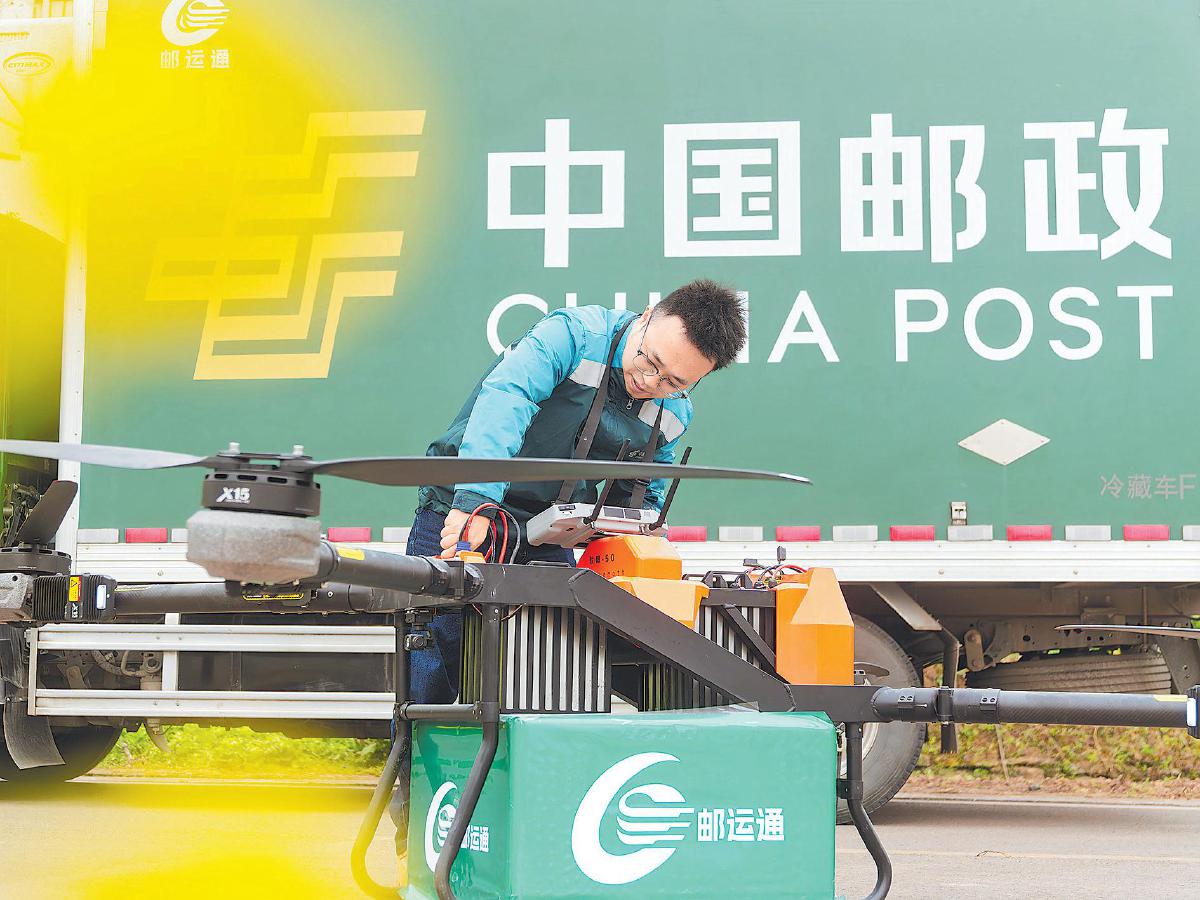 3月13日,重慶郵政飛控員在檢查無人機,保障農資精準送達田間地頭。 □王金莊 攝