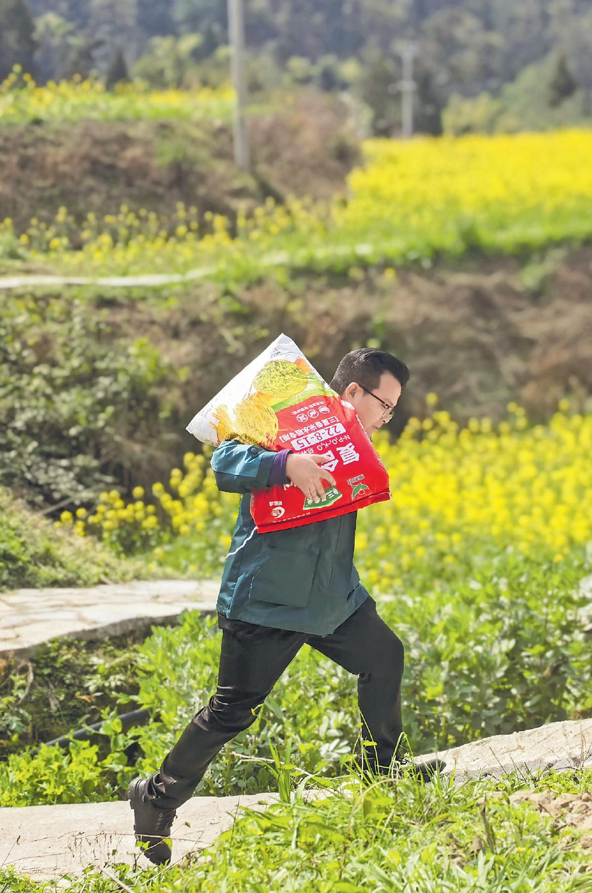 3月11日,郵政投遞員奔走在田埂間,搶農時、保春耕,將農資及時送到農戶手中。 □魏馨 攝