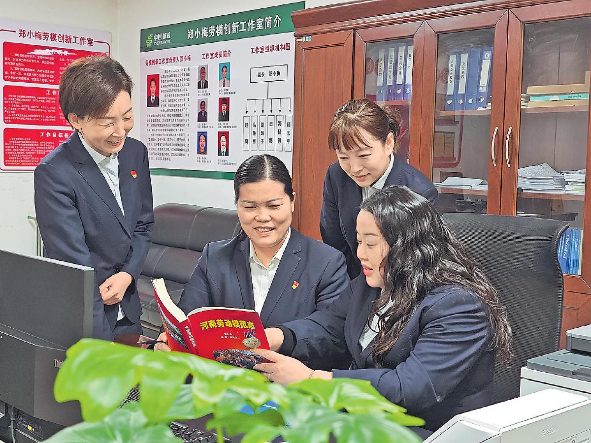 鄭小梅(左二)與勞模創新工作室成員交流學習。