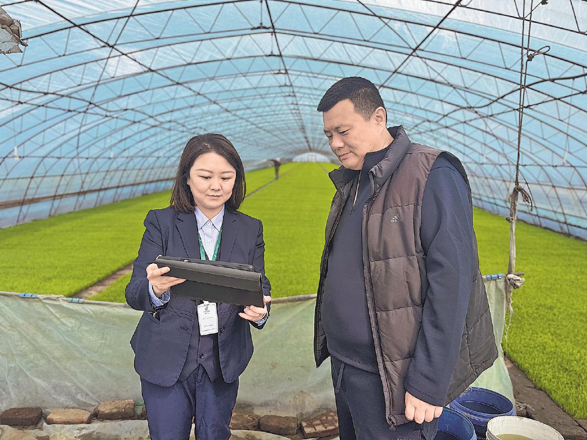 建三江支行客戶經理運用移動展業設備為農戶匹配金融服務方案。(圖片由黑龍江省分行提供)