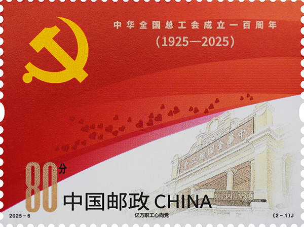 中國郵政定于2025年5月1日發(fā)行《中華全國總工會成立一百周年》紀(jì)念郵票1套2枚,郵票圖案名稱為:億萬職工心向黨、團(tuán)結(jié)奮斗新征程。全套郵票面值2.00元,計劃發(fā)行數(shù)量570萬套。