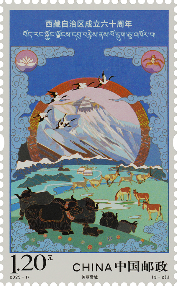 第二枚“美麗雪域”描繪了漫步、奔跑的牦牛、藏野驢、藏羚羊,飛翔的黑頸鶴,以及陽光映照下的珠穆朗瑪峰等元素,人與自然和諧相處的景象躍然紙上,展現了西藏獨特的生態環境和豐富的生物多樣性,體現出西藏在生態保護與生態文明建設取得的顯著成效。