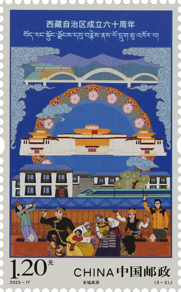 中國郵政定于2025年8月15日發行《西藏自治區成立六十周年》紀念郵票1套3枚,郵票圖案名稱為:同心筑夢、美麗雪域、幸福高原。全套郵票面值3.60元,計劃發行數量為490萬套。