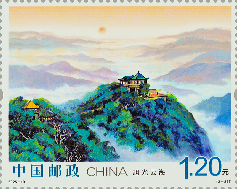 第三枚“旭光云海”,描繪了莫干山的日出景象。該枚郵票定格了莫干山旭日東升的壯麗景象,旭光臺作為莫干山觀賞日出的絕佳觀景臺,將天地交輝的盛景盡收眼底。遠山如黛,云濤似海,萬道金芒為連綿山巒披上錦袍,昭示著此刻的莫干山正以更輝煌的姿態(tài)擁抱嶄新的未來。