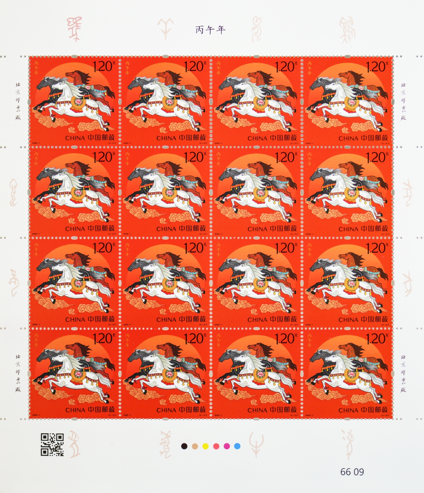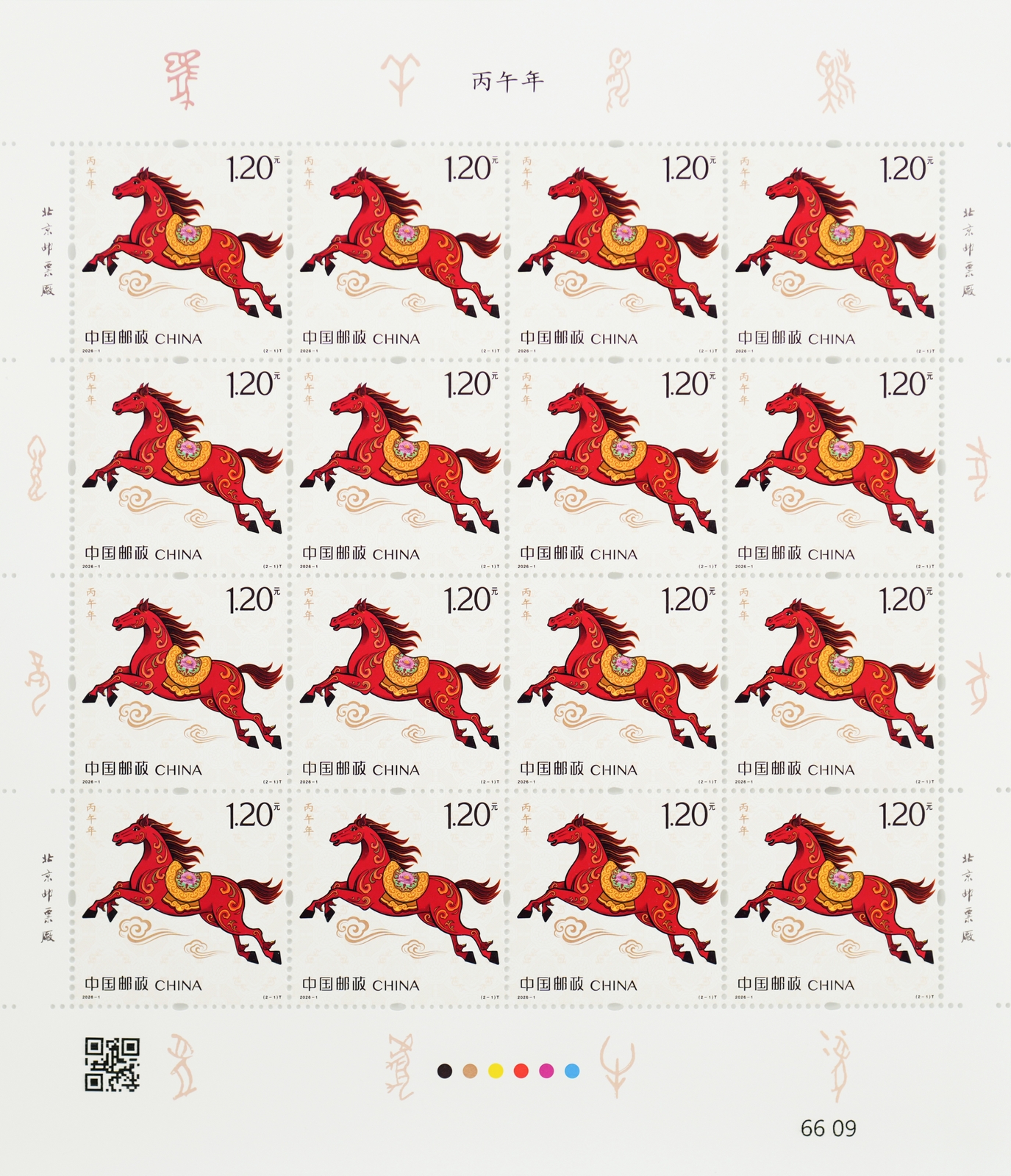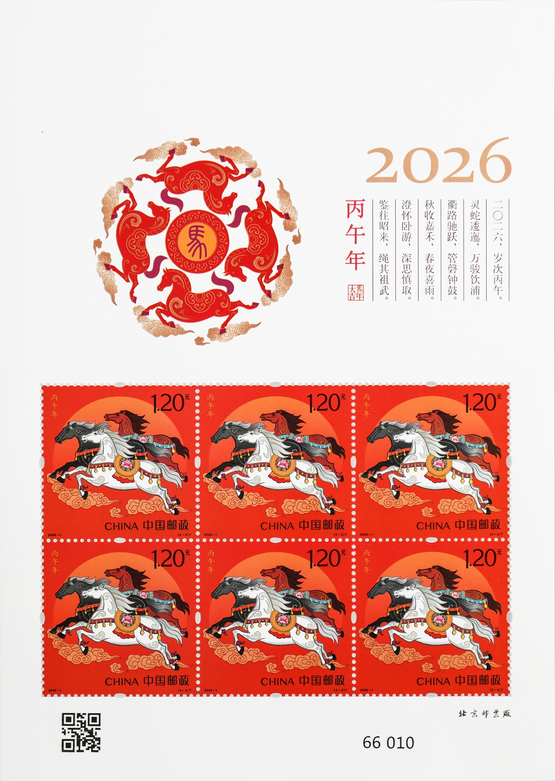 注:同時發行《丙午年》郵票版式三(整張枚數:2套4枚;整張規格:120×160毫米;邊飾設計者:劉喜飛;對聯作者:常江)。計劃發行數量:288萬版。用于贈送給預訂2026年全年紀特郵票的預訂戶。